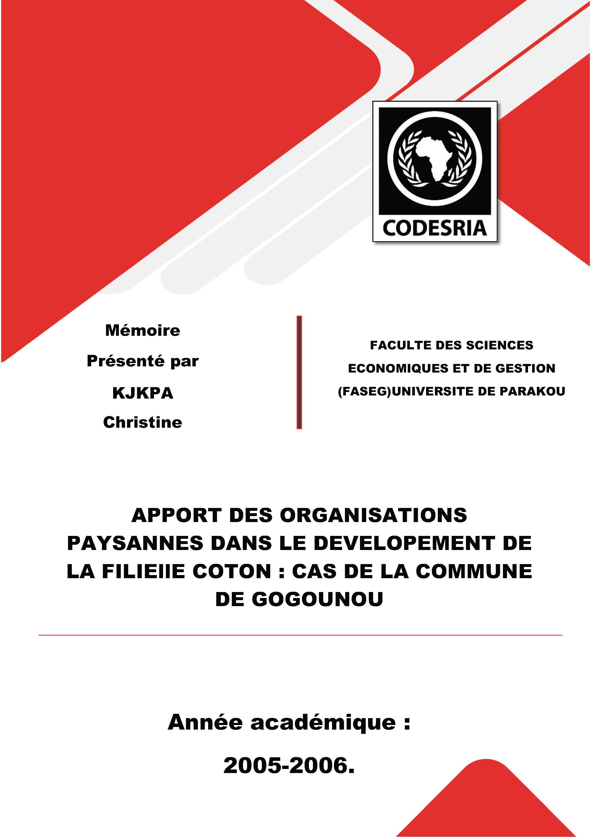 APPORT DES ORGANISATIONS PAYSANNES DANS LE DEVELOPEMENT DE LA FILIEllE COTON: CAS DE LA COMMUNE DE GOGOUNOU