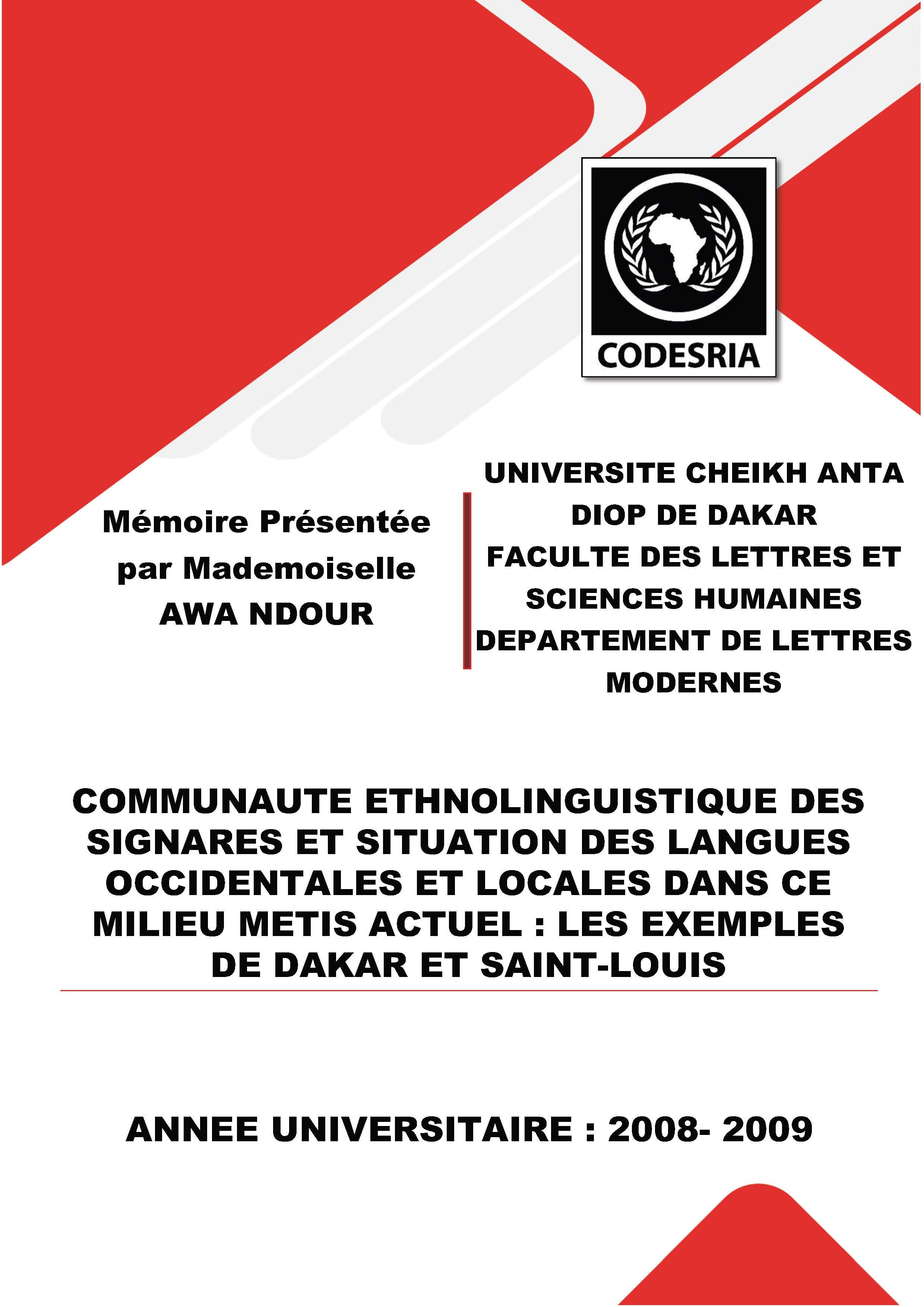 COMMUNAUTE ETHNOLINGUISTIQUE DES SIGNARES ET SITUATION DES LANGUES OCCIDENTALES ET LOCALES DANS CE MILIEU METIS ACTUEL: LES EXEMPLES DE DAKAR ET SAINT-LOUIS